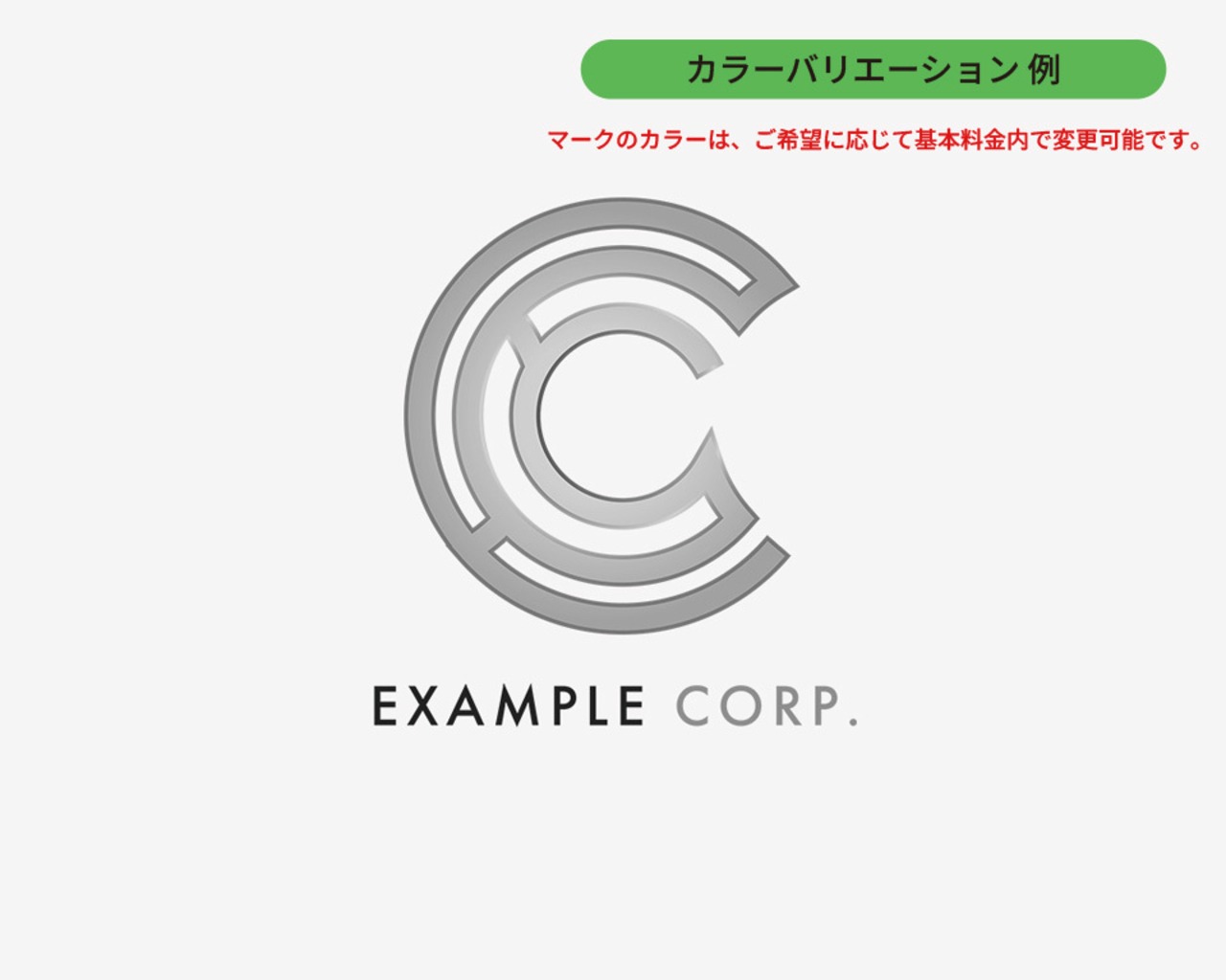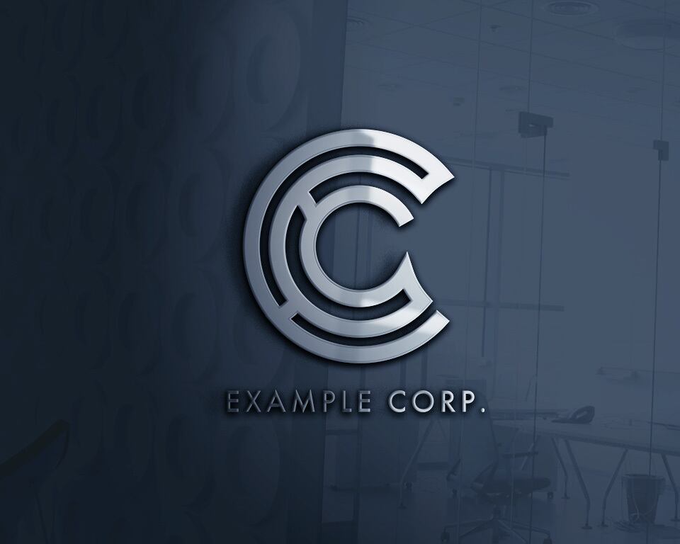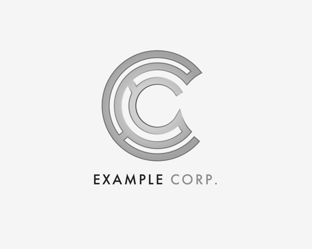 ロゴの説明文: モダンでミニマルな「C」を中心とした同心円デザインのコーポレートロゴ。シルバーグレーのグラデーションが施された3つの円弧が「C」の形を形成し、洗練された印象を与えます。下部には「EXAMPLE CORP.」のテキストが配置され、企業名をシンプルかつ明確に表示しています。黒い背景に映えるシルバーカラーが高級感と信頼性を演出しています。