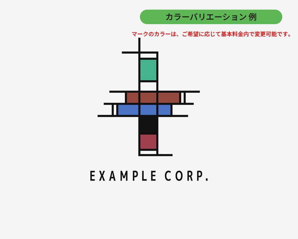 赤、青、黄、水色の鮮やかなブロックと黒い線で構成された、モダンで幾何学的なロゴです。多様な要素が組み合わさり、調和を生み出しています。創造性と秩序を大切にする企業や、多角的な事業を展開する組織に最適です。