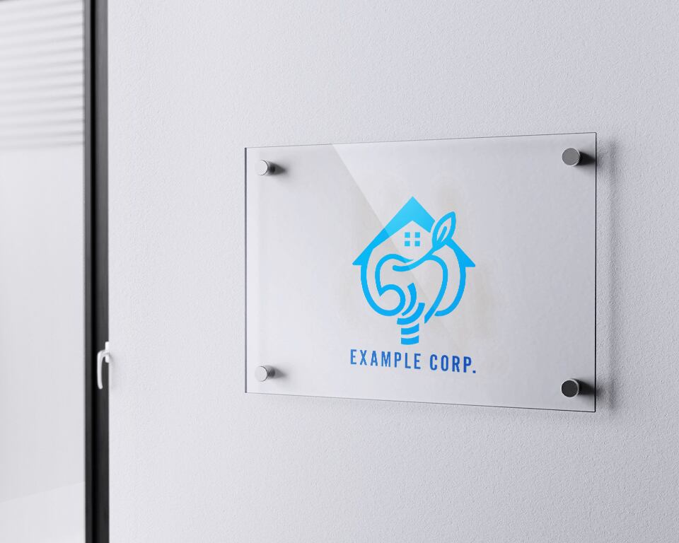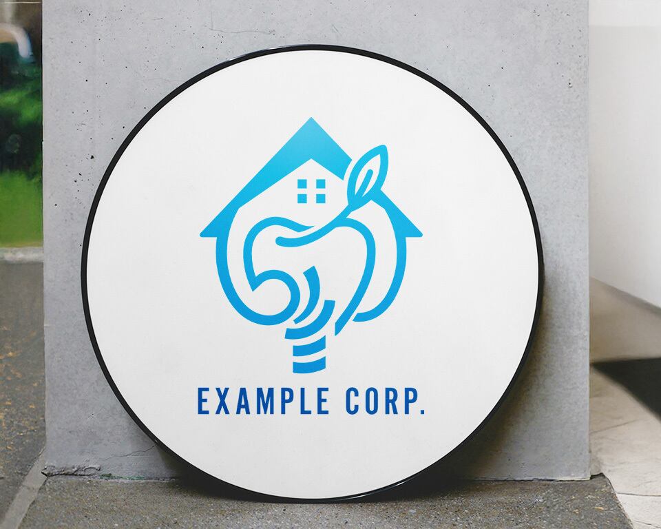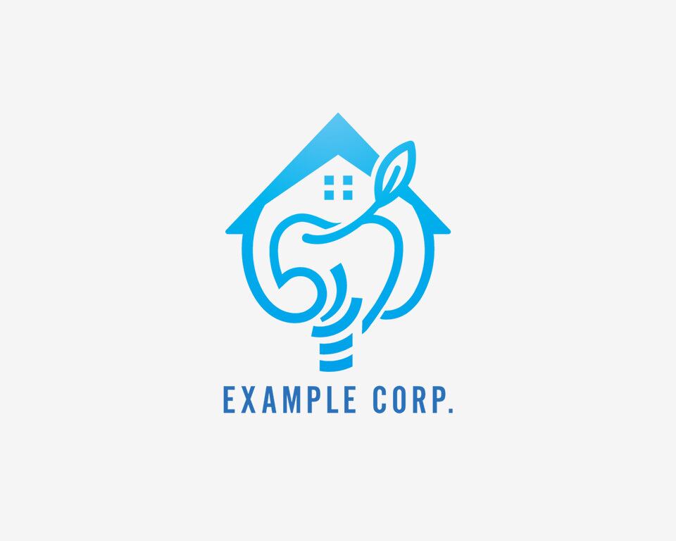 歯の形をベースに、上部には家を、側面には葉を組み合わせた、優しく親しみやすい印象のロゴです。水色のグラデーションは清潔感と先進性を表現し、歯の健康と住まいの安心感、自然の癒しを融合させています。インプラント治療を通じて、快適な生活をサポートするイメージを伝えます。