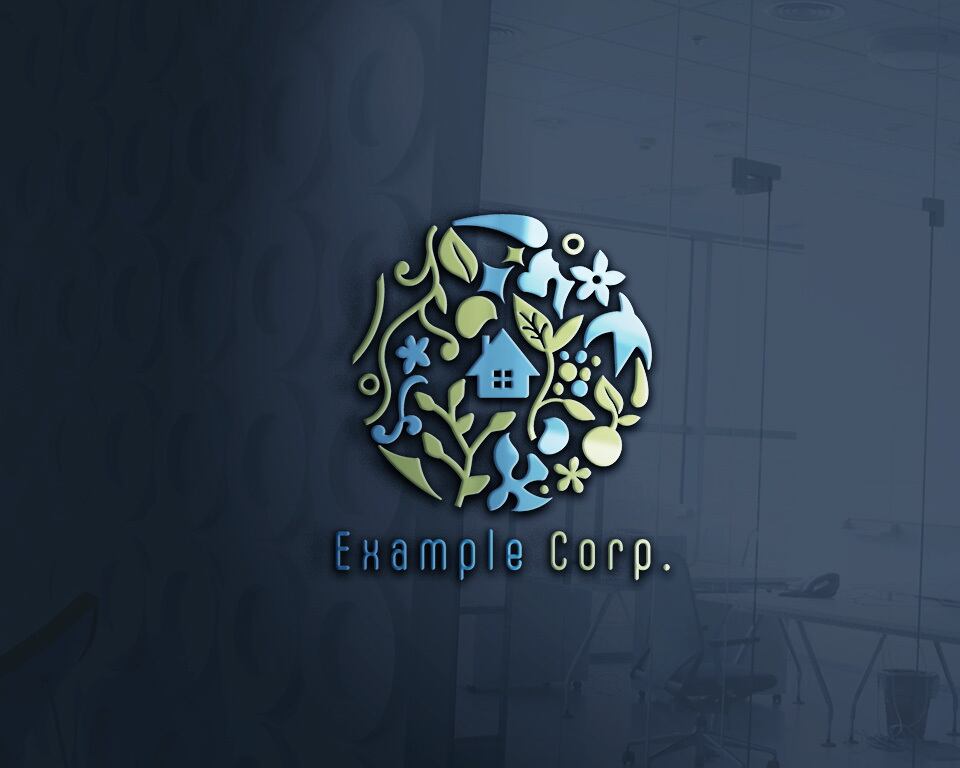 青と黄緑の植物、花、水、そして小さな家を円形に配置した、自然豊かでフレンドリーなロゴです。手書き風の温かいイラストが、オーガニックで уютな印象を与えます。