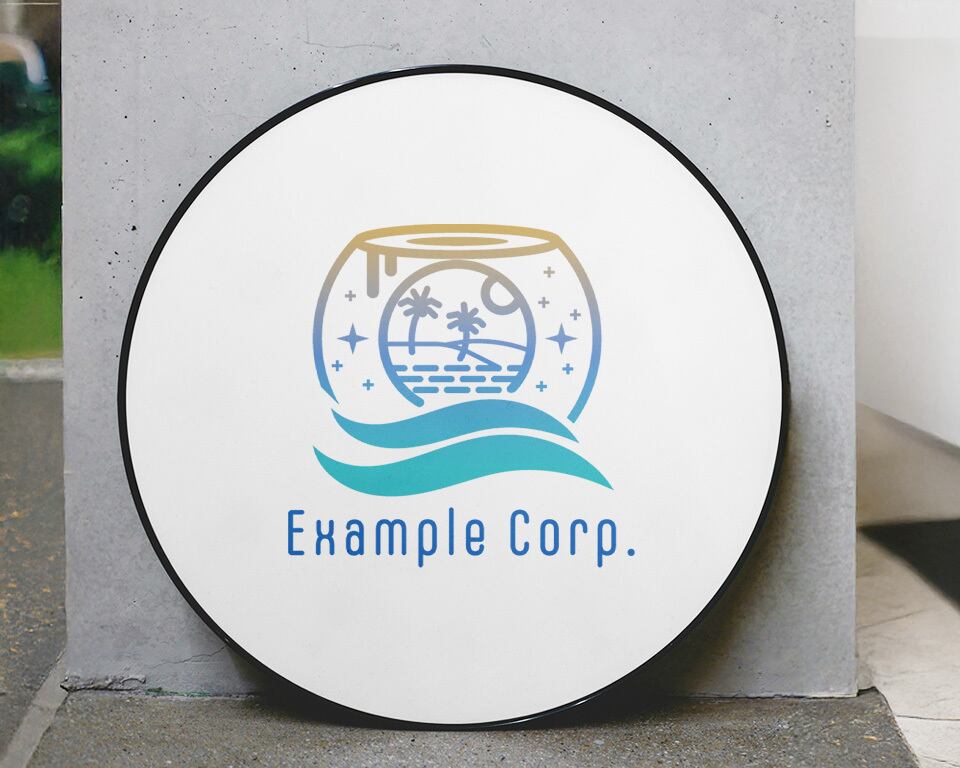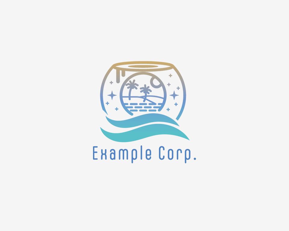 丸い水槽の中に美しい風景が描かれ、下には波の意匠が施された、ユニークで創造的なロゴ。水族館、旅行、環境関連など、美しさや自然をテーマとする業種に最適です。