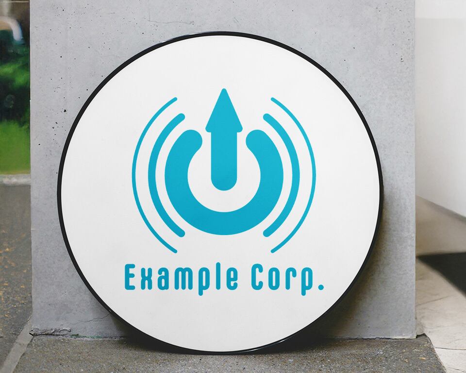 青い起動ボタンの中に上向きの矢印を配置し、周囲に電波のような円弧を加えた、テクノロジー感あふれるロゴ。IT、通信、スタートアップなど、成長や発展、革新性を表現する業種に最適です。