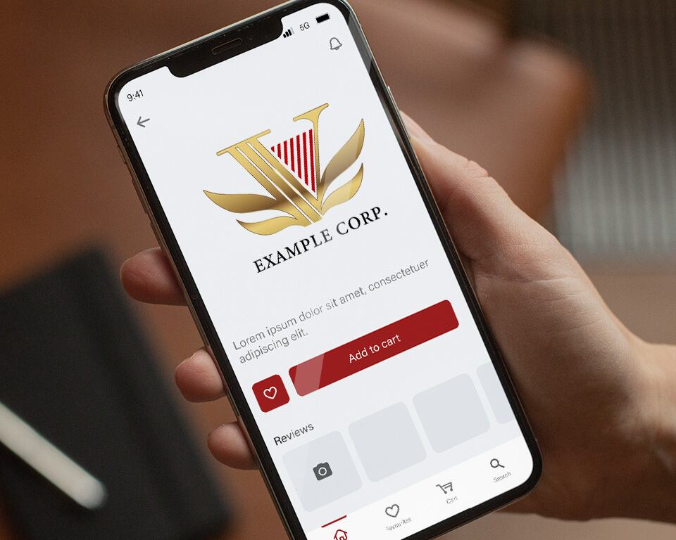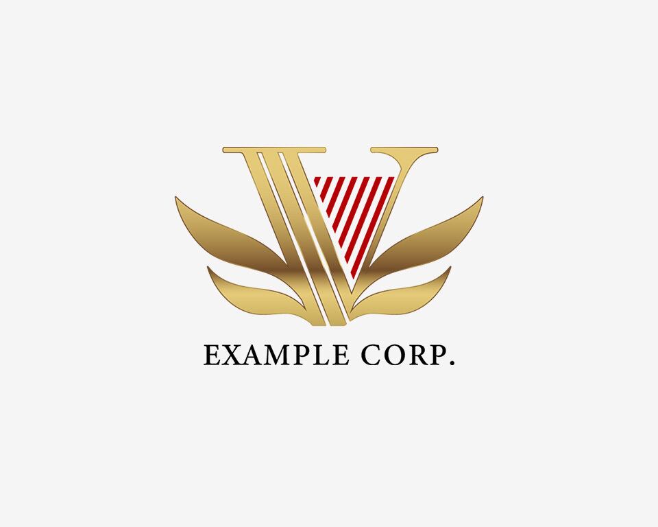 金色のVの文字を中央に、左右に金色の葉のようなモチーフを配置した、エレガントで高級感のあるロゴ。中央のVは赤のストライプで装飾され、情熱的な印象も加わっています。ファッション、美容、ジュエリー関連など、洗練された美しさを求める業種に最適です。