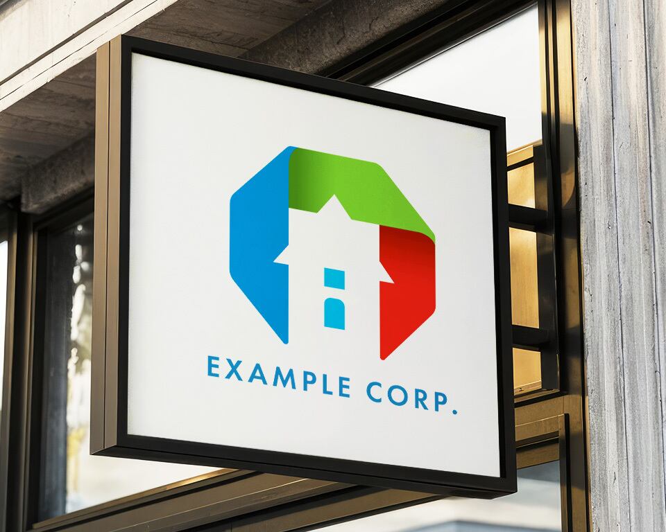 青、緑、赤の柔らかな帯状の素材が折り重なり、中央に家のシルエットが浮かび上がり、上向きの矢印のような形状も見える、創造的で発展的な印象のロゴ。不動産、建築、コンサルティングなど、成長と未来志向のイメージを求める業種に最適です。