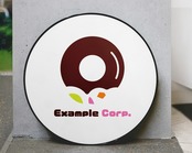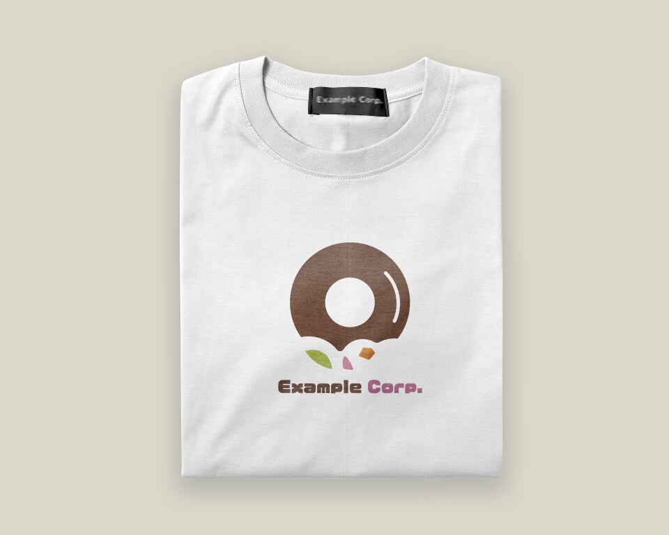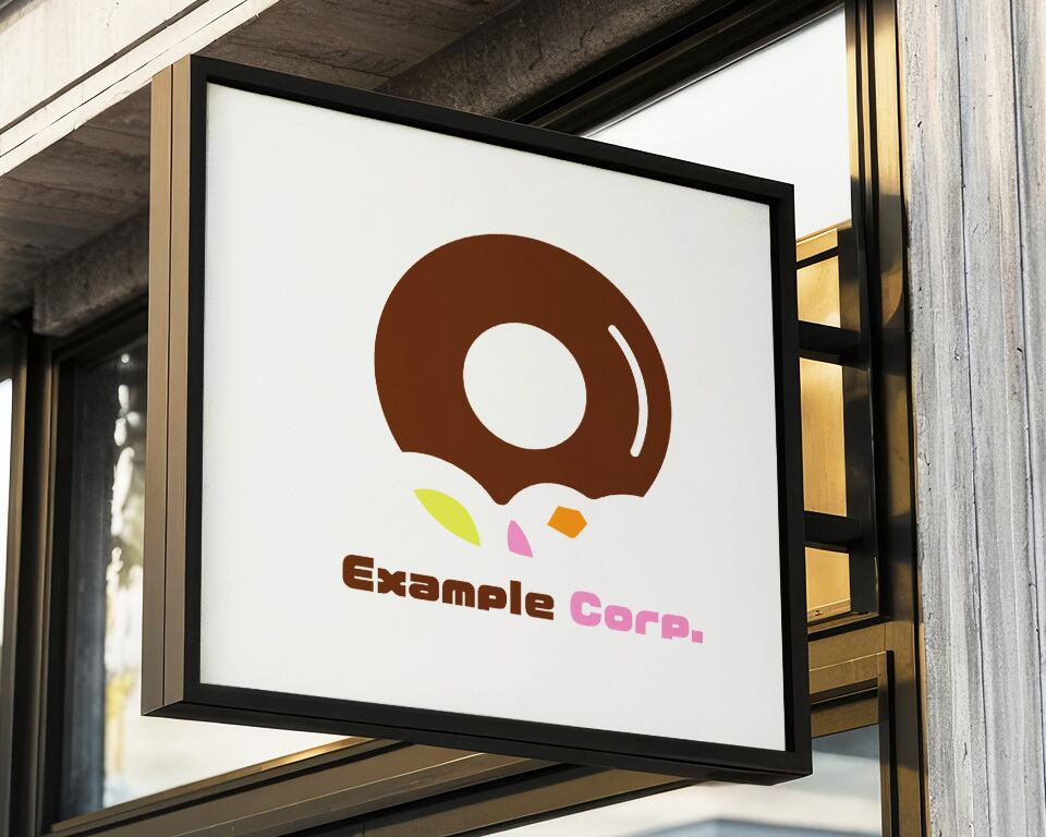 茶色のドーナツの一部が齧られ、そこからピンク、緑、オレンジのカラフルな破片が飛び出す、ユニークで遊び心のあるロゴ。飲食・フード関連、スイーツ店、エンターテイメントなど、楽しさとサプライズ感を求める業種に最適です。